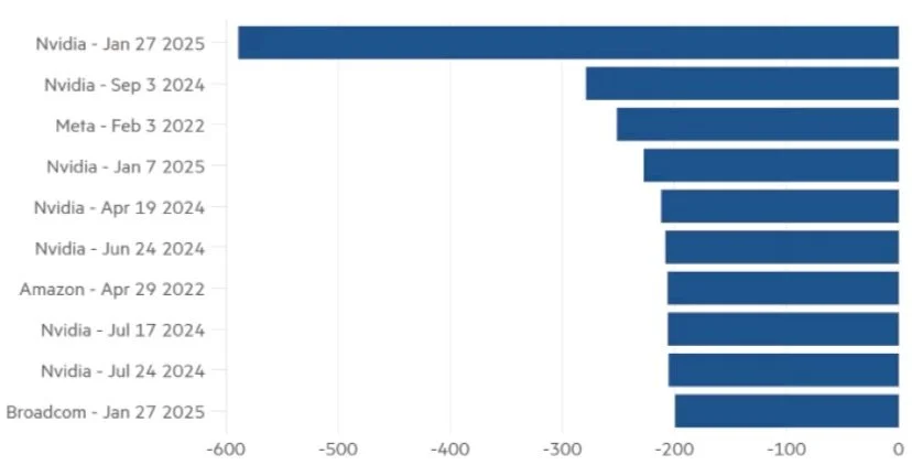 The market reaction was swift and unforgiving. Nvidia lost $589 billion of market capitalisation. This is larger than the individual market values of all but 13 US companies and is by far the largest single-day value wipeout of any company in history.