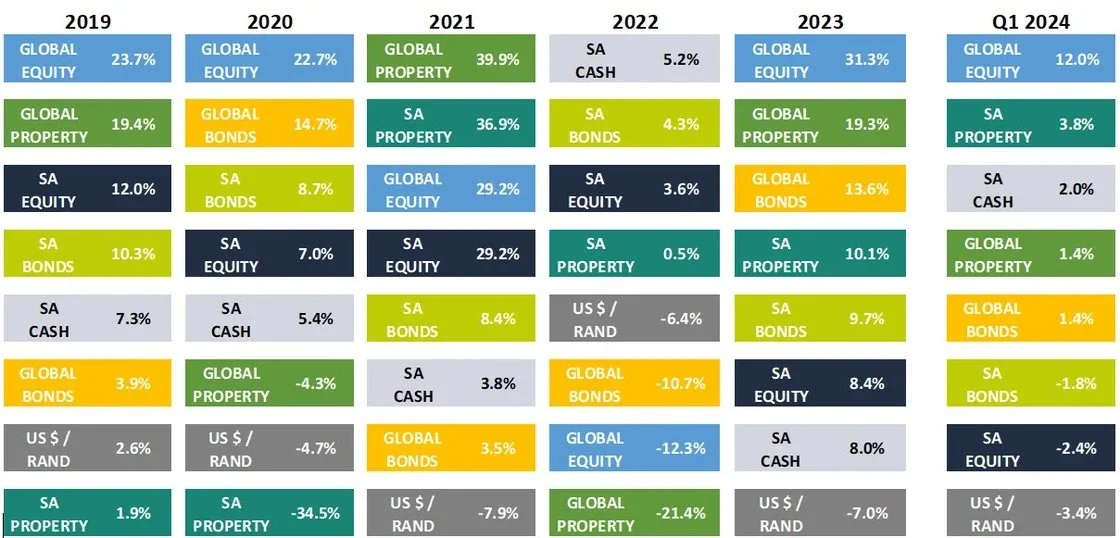 FIVE YEAR ASSET CLASS RETURNS MATRIX (in Rand terms)