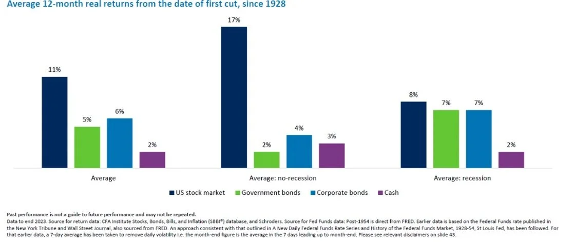 In September, the Federal Reserve (the Fed) decided to lower interest rates by 0.5%, bringing them down to a range of 4.75%–5.0%. This move follows a period of rapid rate increases and puts the Fed in line with other central banks that have also started to cut rates. By looking at how markets have reacted to rate cuts in the past, we can get a sense of what might happen next. We examine past rate-cutting periods in the US under various economic conditions to understand what kind of returns investors might expect.