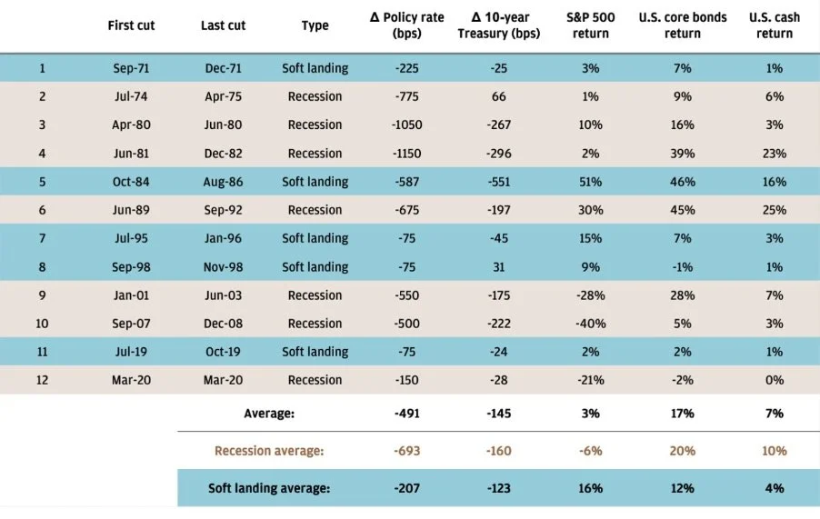 When we look at different inflation periods, we see that the best times for US stock returns have been when inflation is between 1-3%. Currently, inflation is at 2.5%, which is right in that sweet spot. If we continue to see growth, stable or falling inflation, and interest rate cuts, it would be an ideal situation for riskier investments like stocks. However, this describes a goldilocks situation, and these are rare. To look at the alternative we need more detail. Below we see each rate-cutting cycle going back to 1970 for the US categorised by whether the rate cuts coincided with a soft landing or a recession.