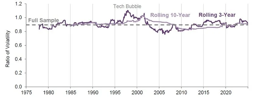 Source: AQR, MSCI. Chart shows ratio of volatilities of MSCI U.S. Cap-Weighted and Equal-Weighted indices, based on monthly data. A ratio trending upwards would suggest that the cap-weighted index is becoming relatively riskier. Daily data shows a similar pattern. Jan 1, 1975 - Dec 31, 2024