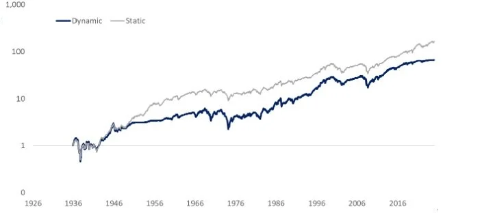 CHART 4: Cumulative returns of constant and dynamic strategies (log scale)