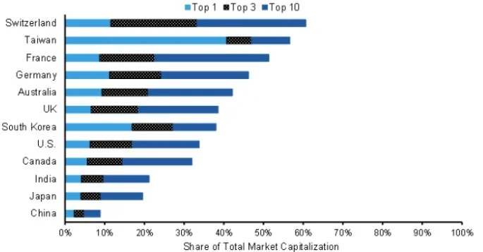 CHART 2: Stock market concentration in the largest global equity markets