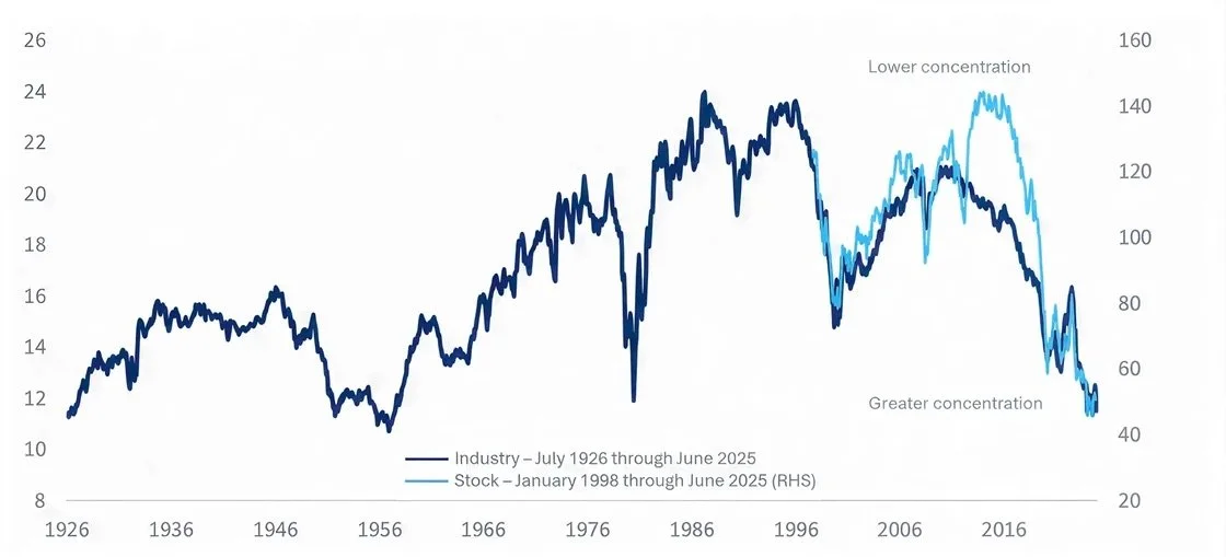 The chart above shows that the US equity market has indeed become more concentrated in recent years, driven both by industry effects (notably technology) and by individual stock effects. However, measured over long history, today’s concentration is not unprecedented and sits well within historical experience.